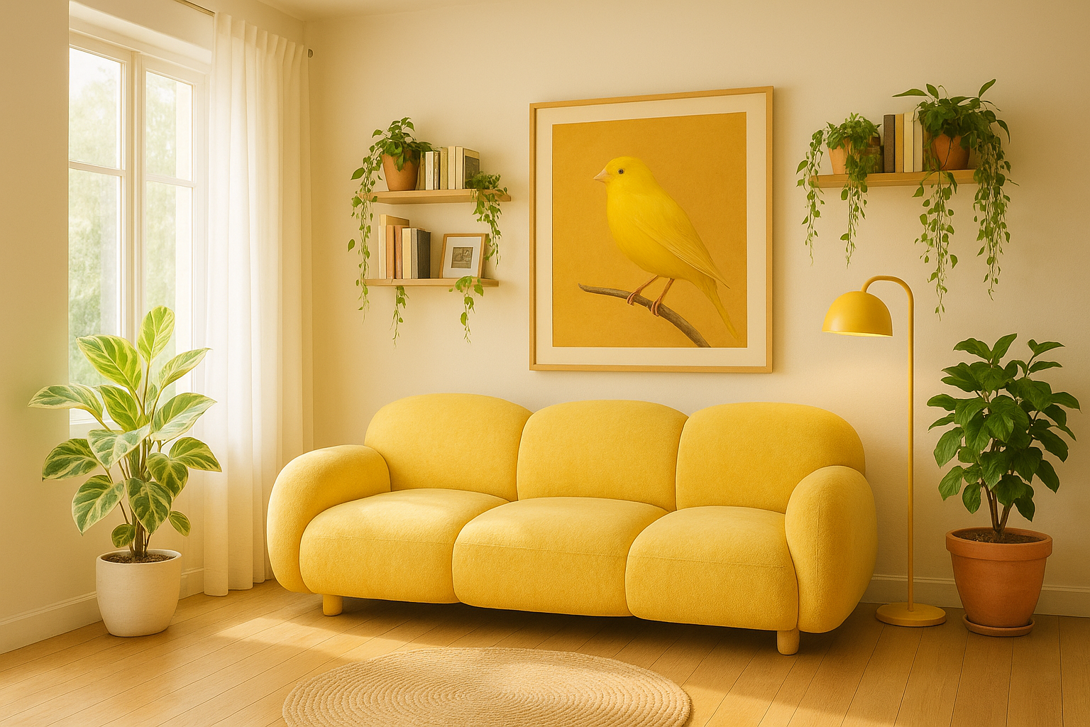 러그 or 커튼 → 연노랑/머스터드 옐로우 톤으로 공간에 밝은 기운 추가.