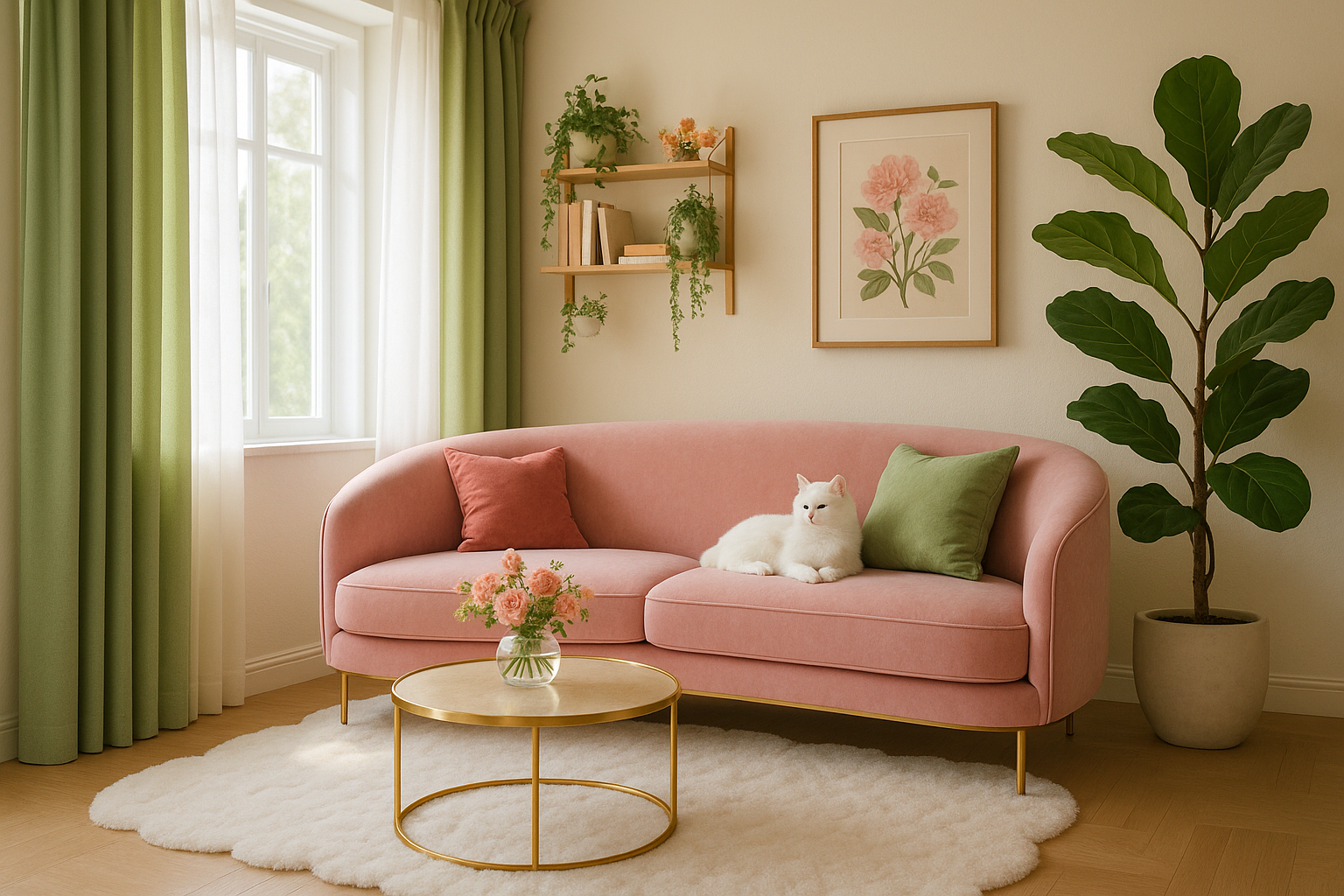 거실 중심에는 큰 식물, 벽이나 선반에는 핑크·골드 포인트 소품 배치.