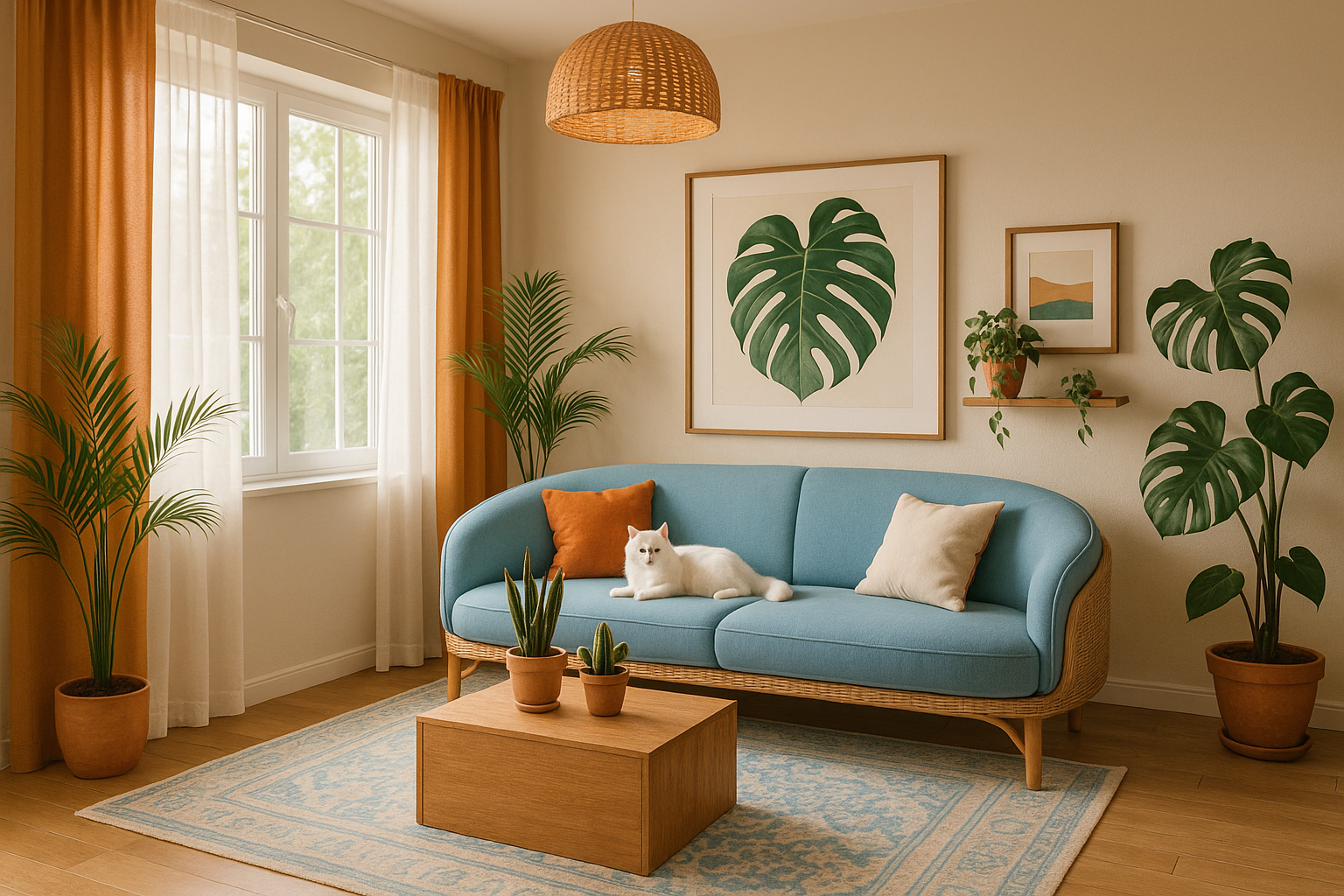 소파 뒤 하늘색 벽 + 주황 쿠션 + 큰 초록 식물