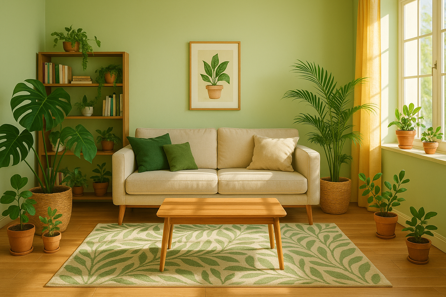 내추럴 그린 → 초록 소품에 우드 가구 섞어서 자연스러운 감각.