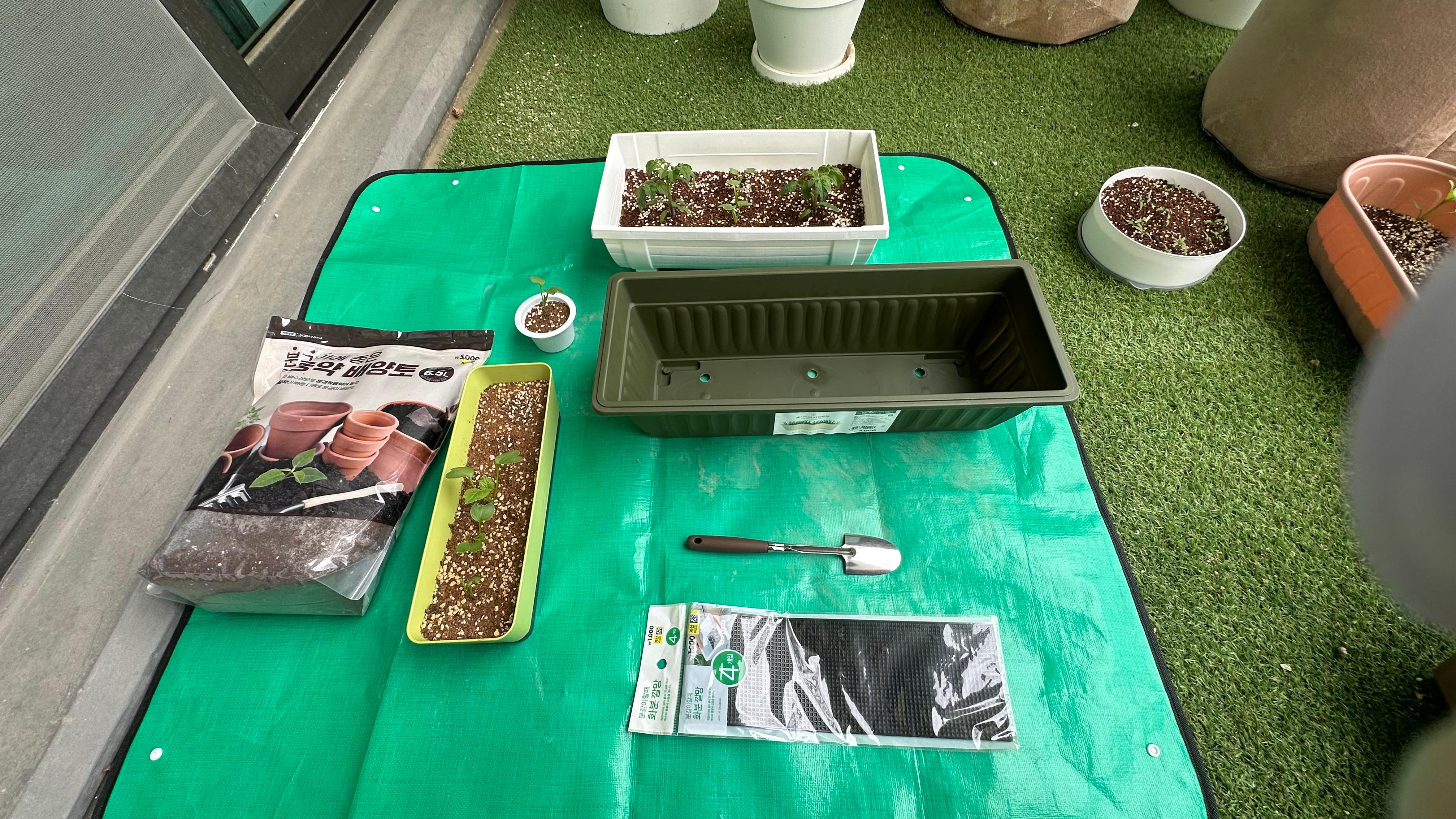 - 화분, 열무모종, 배양토, 삽, 화분깔망